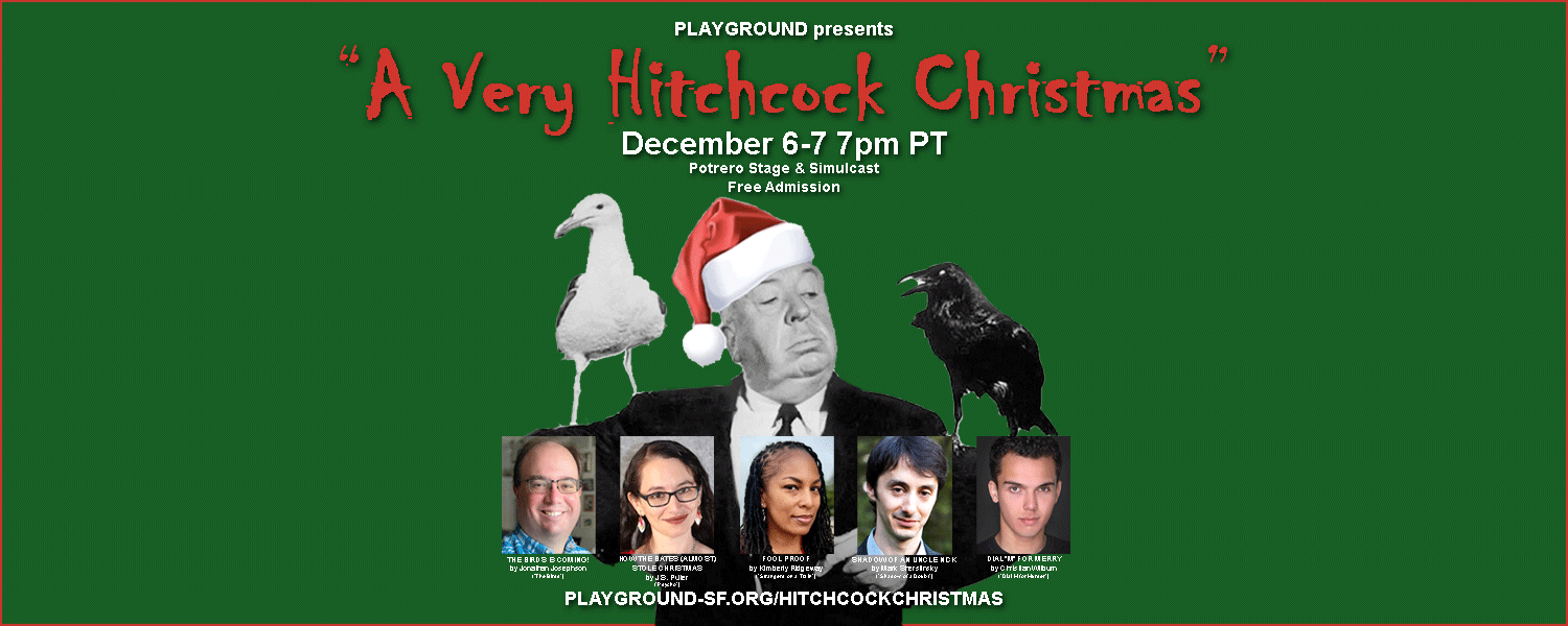 What happens when RALPHIE Parker and Ethan GRINCH meet on an Amtrak and devise a plan to help each other achieve their biggest holiday desires? Or, how can we bear with the fact that Santa was found dead in a couple’s apartment; but was St. Nick’s untimely death a result of self-defense…or murder?? Enjoy these outrageous Hitchcockian spoofs, and many more, for one weekend only at A VERY HITCHCOCK CHRISTMAS, PlayGround’s fourth annual “twisted” holiday” show, inspired by the iconic films of Alfred Hitchcock. Made up of five short plays, the complete performance will take place live in-person at Potrero Stage in San Francisco and be simulcast nationally on Vimeo Live: December Dec 6-7 at 7:00 p.m. PST. Admission free (suggested donation $10-30). Make Reservations HERE.